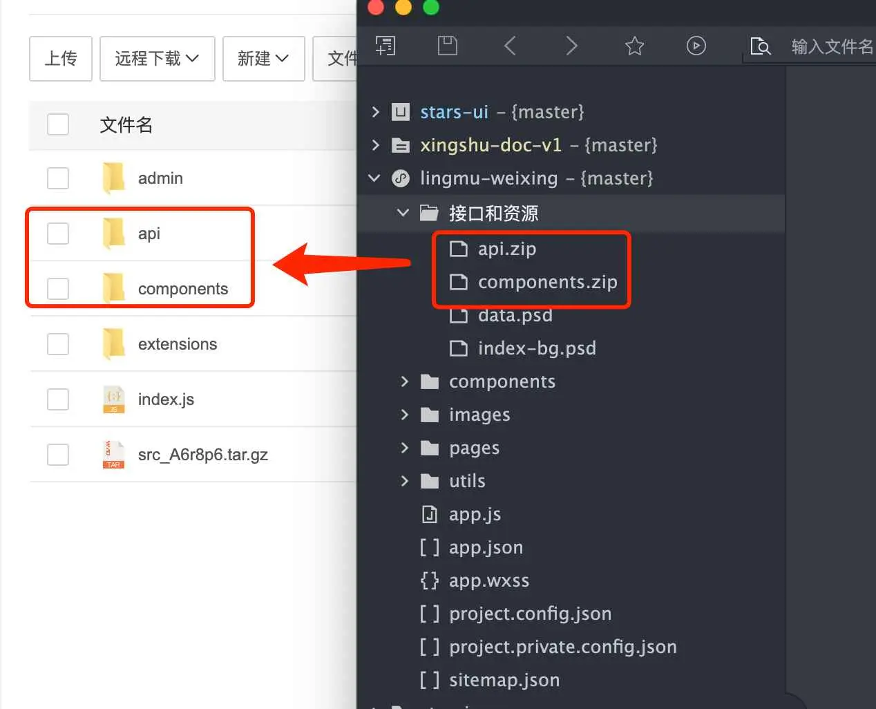 V3.0开始只要打开项目目录my-project将下载好的小程序源码中的server.js和src.zip上传解压