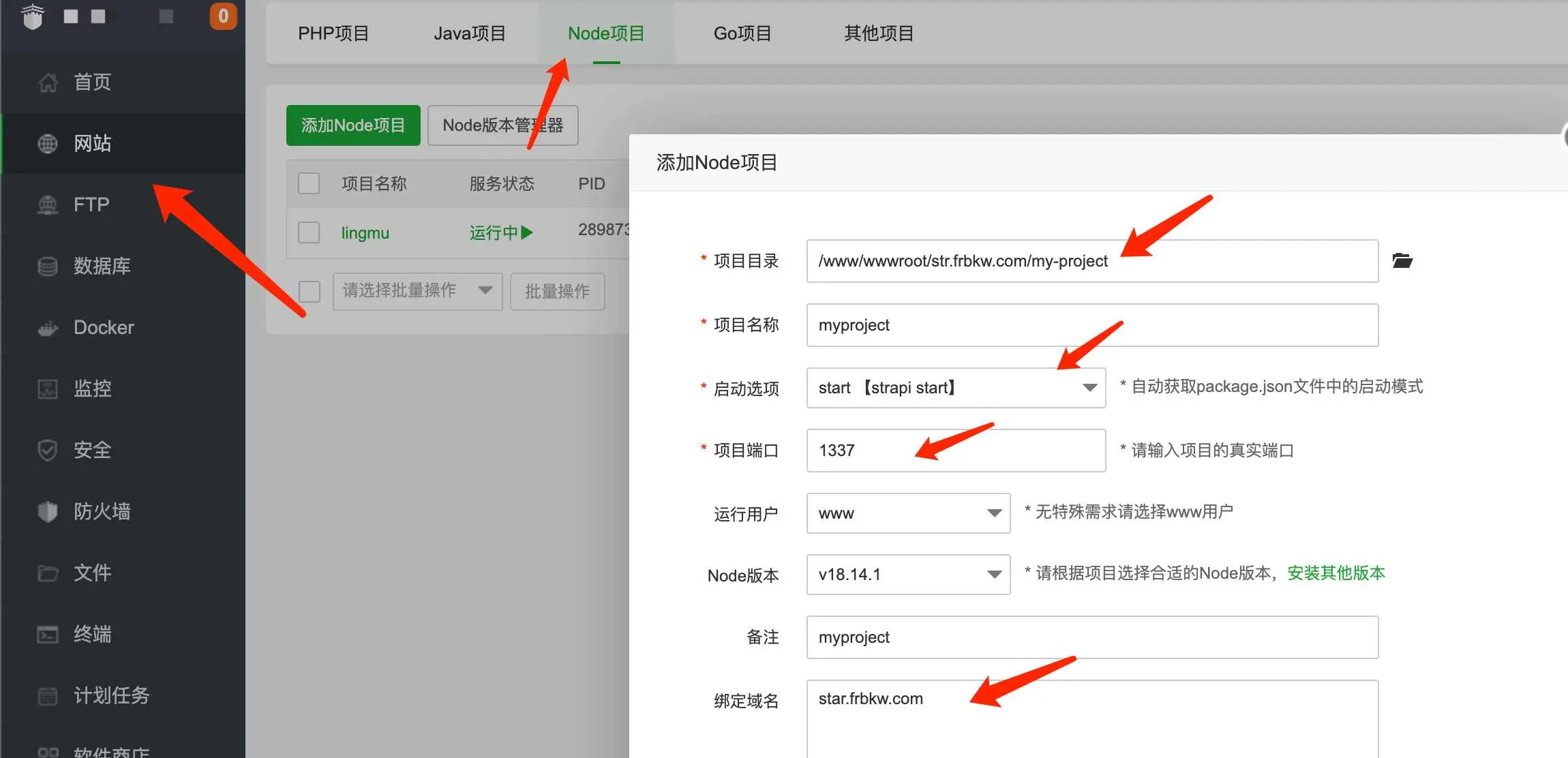 左侧菜单点击网站—-Node项目—-添加Node项目