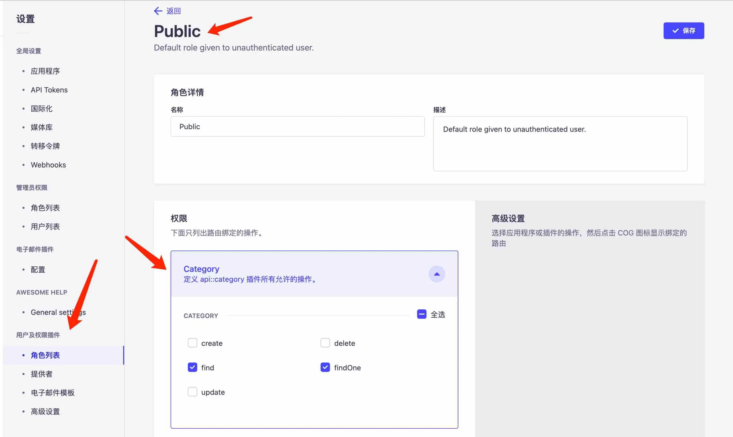 strapi后台设置--角色列表---Pubilc,API中的字段需要设置权限不然无法访问