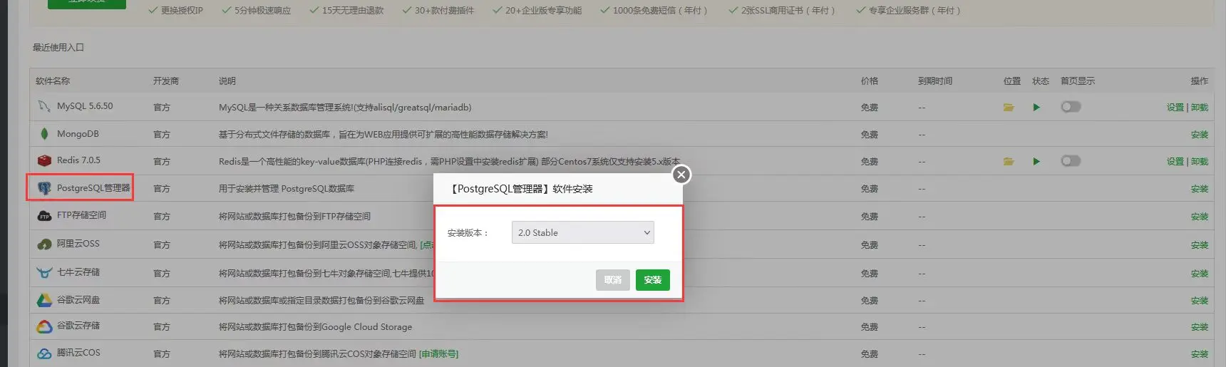 宝塔-->软件商店-->PostgreSQL(教材案例)或者用MySql 5.7+