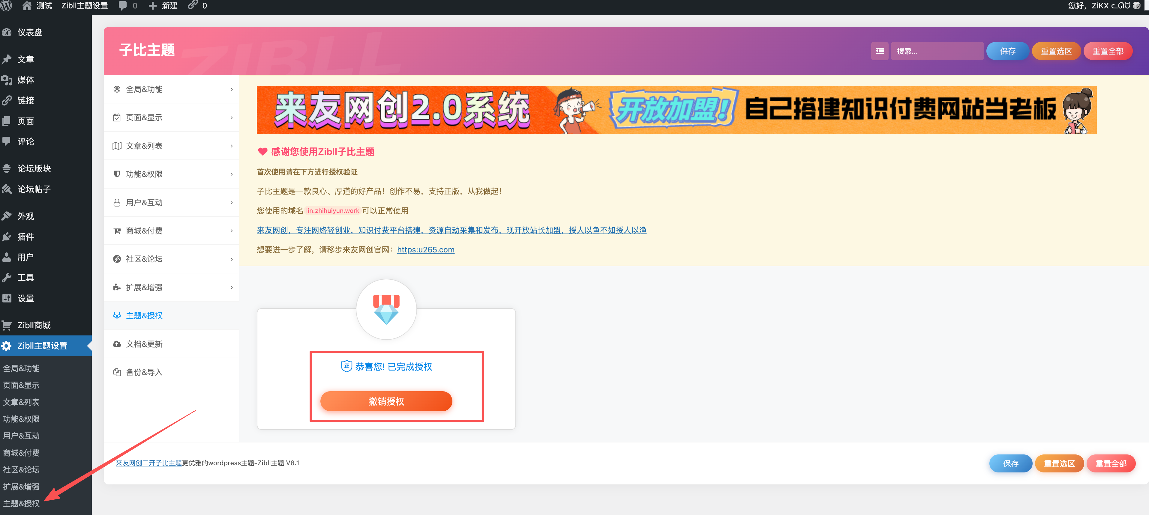 /wp-content/themes,解压(或者你也可以在后台主题上传也可以)。进入网站后台,启用子比主题。