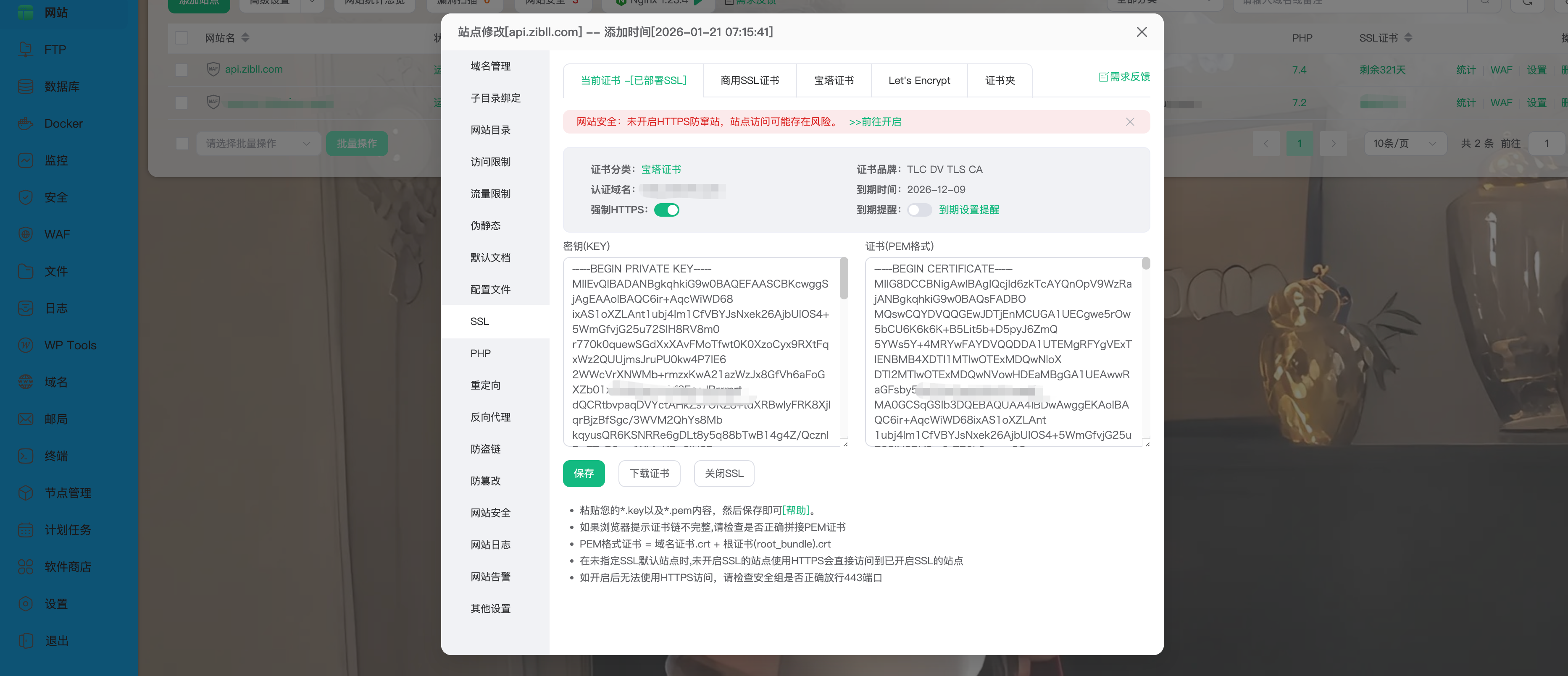 随便找一个已开启 SSL 的网站,复制那里的密钥和证书,粘贴到api.zibll.com这个网站的 SSL 配置中,保存并强制开启 HTTPS。