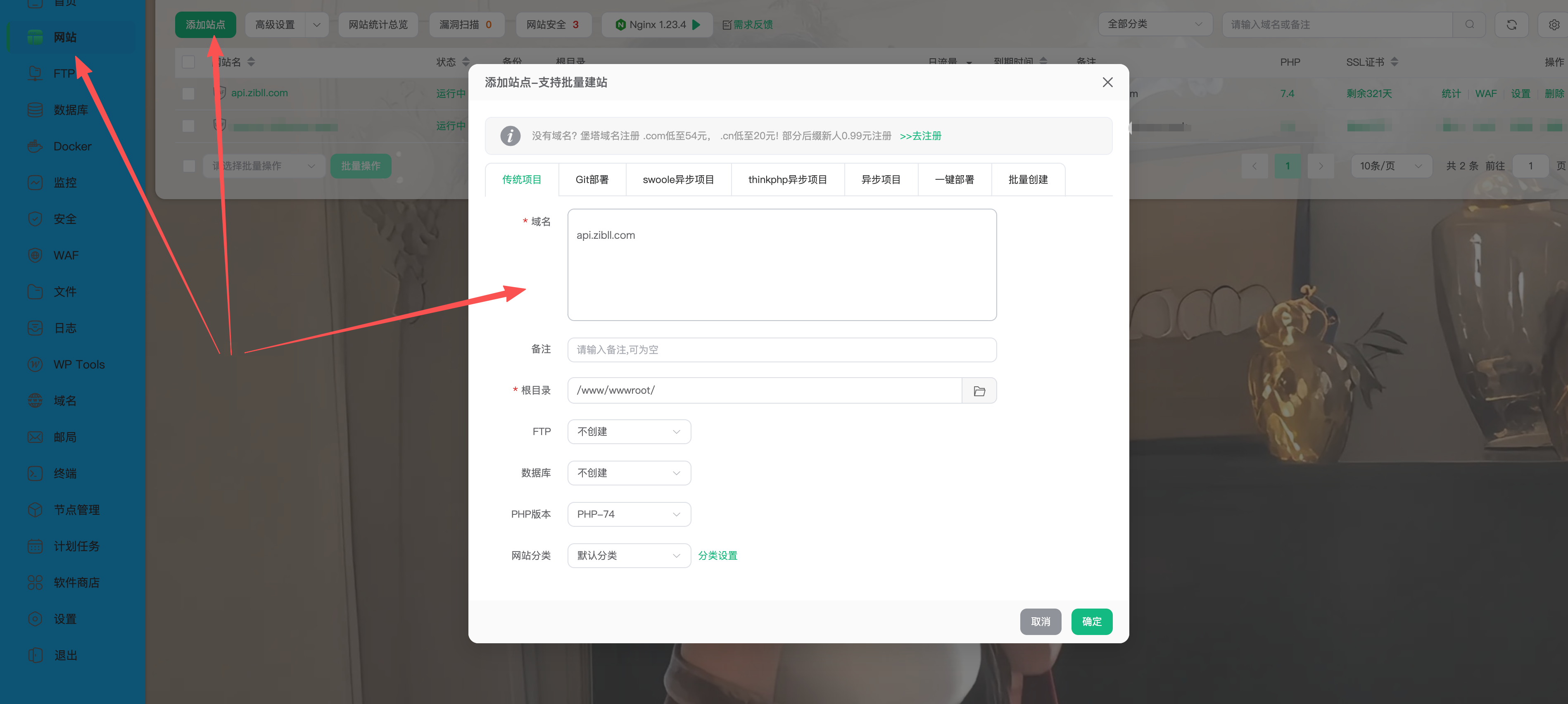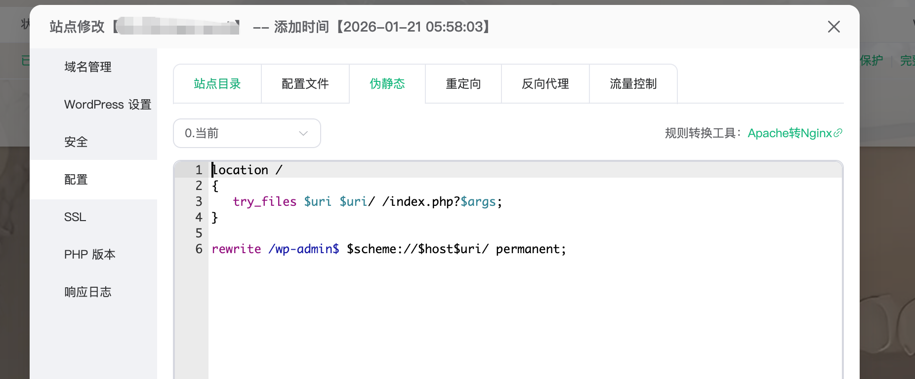回到网站设置,配置伪静态(注意不要有多余空格):