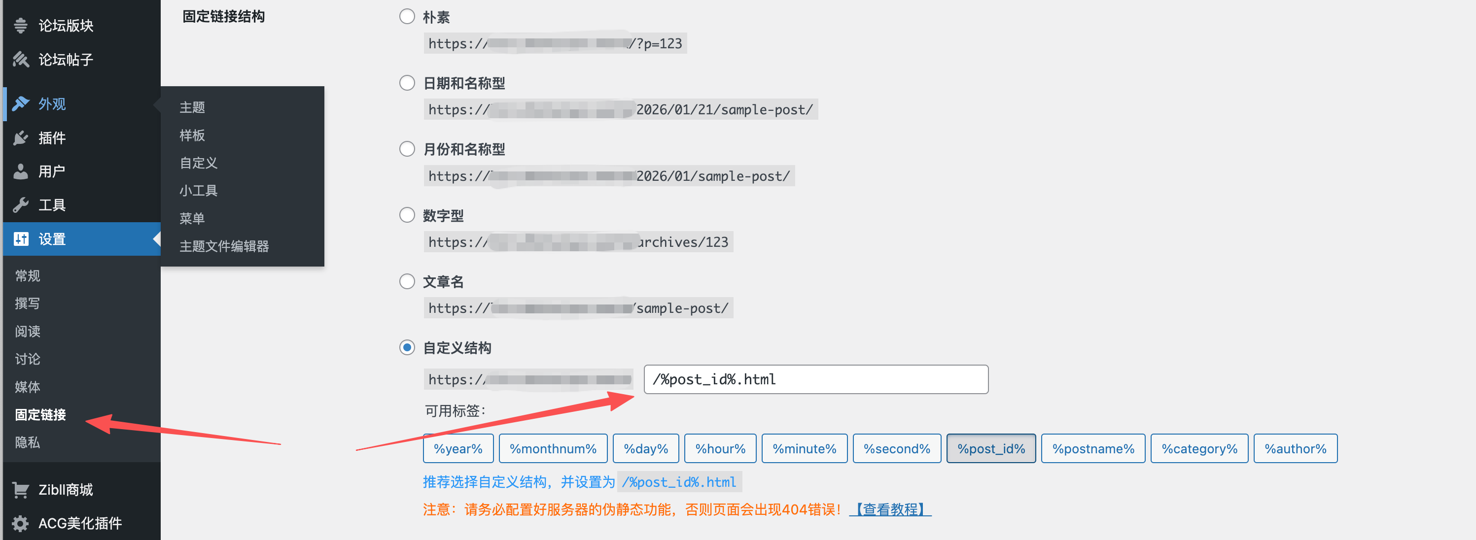 (不设置伪静态和固定链接的话,部分页面可能出现 404。)
