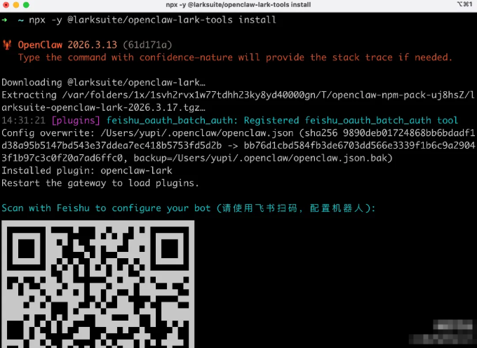 官方提供了对接飞书的插件,先在终端输入一行命令安装: