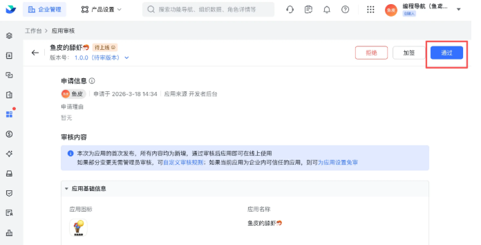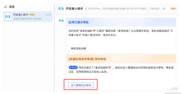 你会在飞书收到应用审批的消息,进入管理后台审核即可: