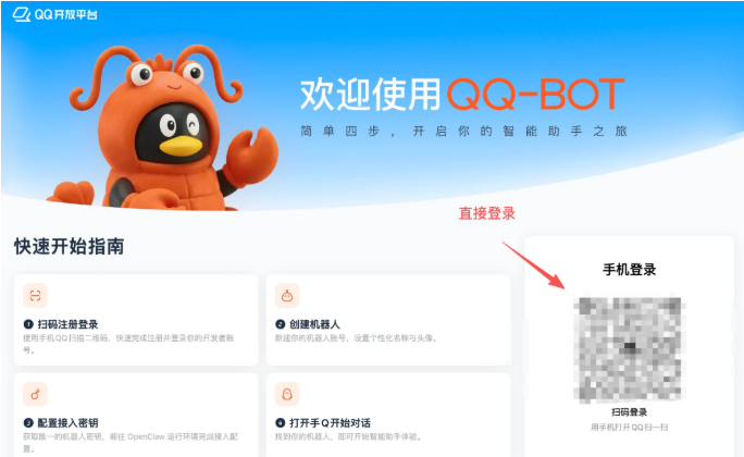 打开QQ 机器人 OpenClaw 接入页面,用 QQ 扫码登录: