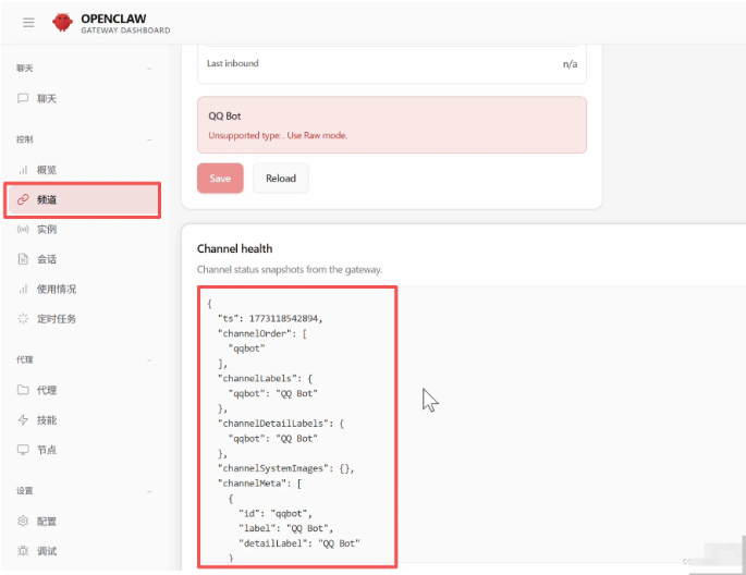 接入成功后,你可以在OpenClaw的网页控制台的「频道」(Channels)板块看到已经接入了QQ机器人渠道: