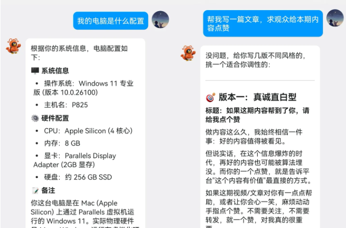 直接在QQ上给小龙虾发消息下达任务,比如让它查看电脑配置、或者帮你写一篇文章。完成速度很快,而且支持Markdown格式输出,阅读体验不错: