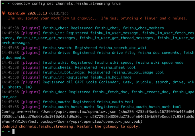 飞书插件还支持开启流式响应,实现打字机效果。打开终端,执行命令: