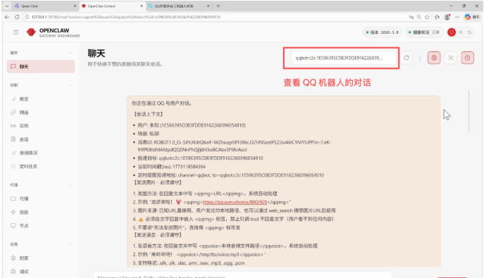 如果你好奇它背后做了些什么,可以在OpenClaw的网页控制台中查看跟QQ机器人的完整对话记录: