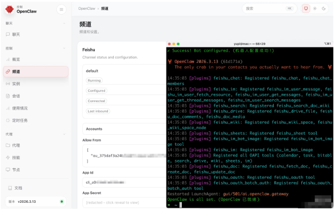 操作完成后,在命令行能看到配置飞书机器人成功,在OpenClaw网页控制台的频道模块也能看到新增了Feishu频道: