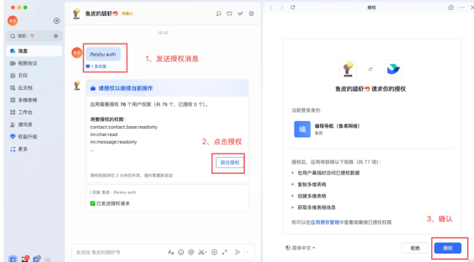进入聊天,先发送/feishuauth授权,傻瓜式操作: