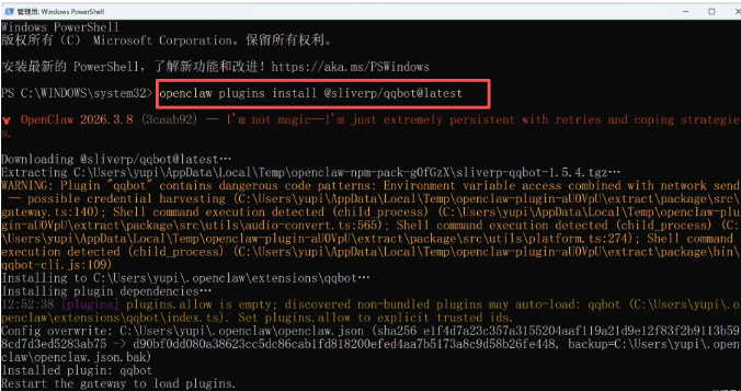 然后直接在命令行中用飞书扫码对接机器人(Windows的PowerShell无法正常显示二维码,需要改为使用自带的CMD 命令行)。