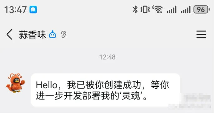 创建完成后,手机QQ立刻就会收到小龙虾打招呼的消息: