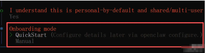 建议新手直接选Quickstart,它会帮你用默认配置快速搞定,人工模式适合有一定养虾经验的同学