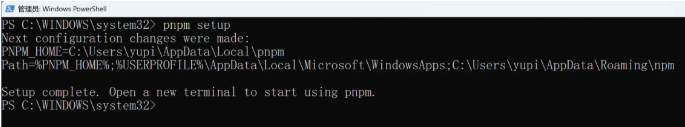 注意!执行完pnpmsetup后,一定要关闭当前 PowerShell窗口,重新以管理员身份打开一个新的。这是为了让刚才配置的环境变量生效。