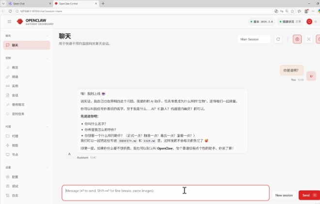 选择之后,浏览器会自动打开OpenClaw的网页控制面板。恭喜,你的龙虾1号准备就绪!