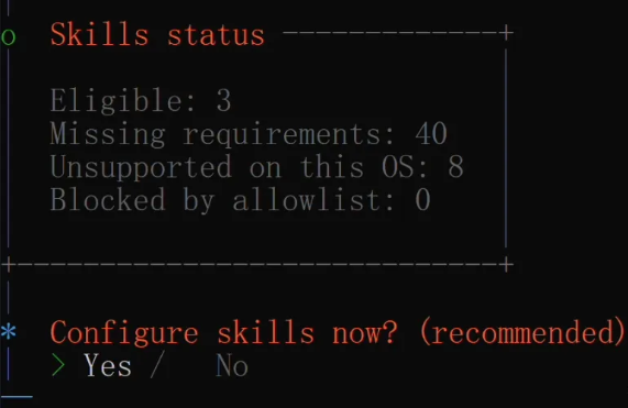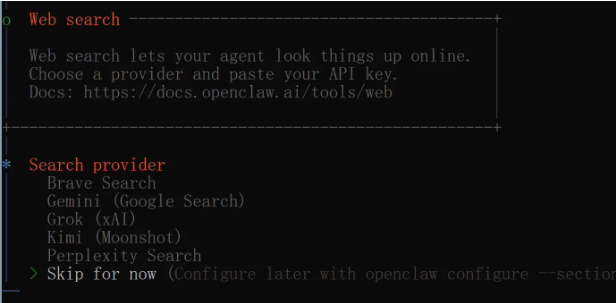 接下来还会问你要不要配置搜索服务提供者(比如BraveSearch),也建议先跳过,这些都需要额