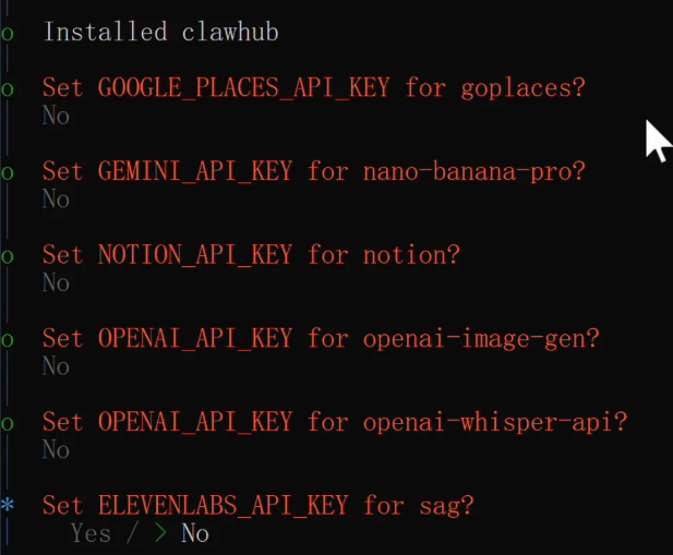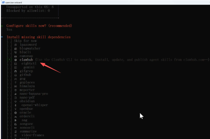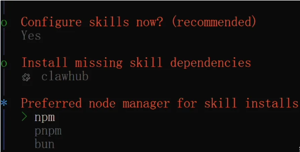 然后引导程序会列出一些推荐的技能包,这里建议至少添加ClawHub这一个。ClawHub是OpenClaw的官方技能市场,装了它之后,你的小龙虾就可以随时搜索和安装社区里上千个技能包,快速扩展自己的能力,非常方便。其他的技能按需选择即可。