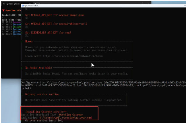 接下来会自动安装并启动OpenClaw的Gateway网关服务。你可以把网关理解成OpenClaw的总调度中心,它负责接收你从各个渠道(网页、QQ、飞书等)发来的消息,分配给AI处理,再把结果返回给你。