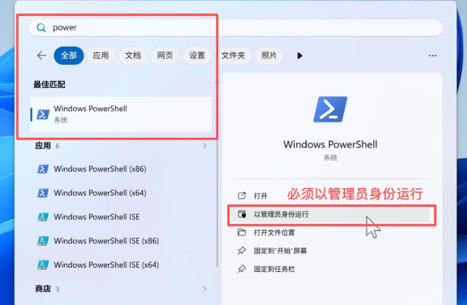 在电脑的搜索栏中输入“PowerShell”,右键选择以管理员身份运行: