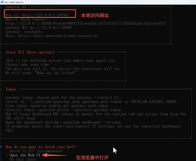 启动成功后,引导程序会问你是在终端界面(TUI)还是网页浏览器中使用OpenClaw。