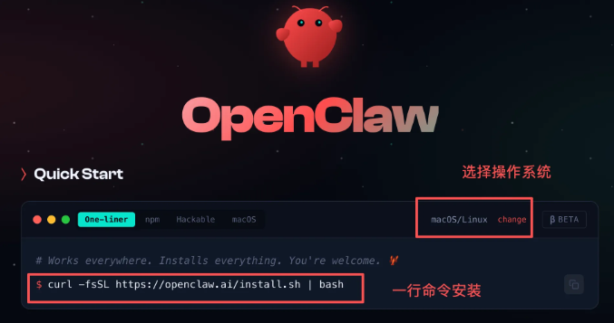 curl -fsSL https://openclaw.ai/install.sh | bash这行命令会自动帮你安装所有依赖和OpenClaw本体,一步到位,装完就可以直接跳到第二步-安装配置OpenClaw。