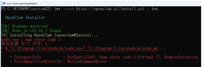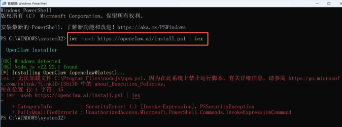 iwr -useb https://openclaw.ai/install.ps1 | iex不出意外肯定会报错
