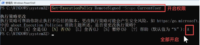 Set-ExecutionPolicy RemoteSigned -Scope CurrentUser如果弹出确认提示,输入A然后按回车即可。这行命令的作用是允许运行来自可信来源的脚本,类似手机上允许安装第三方应用。