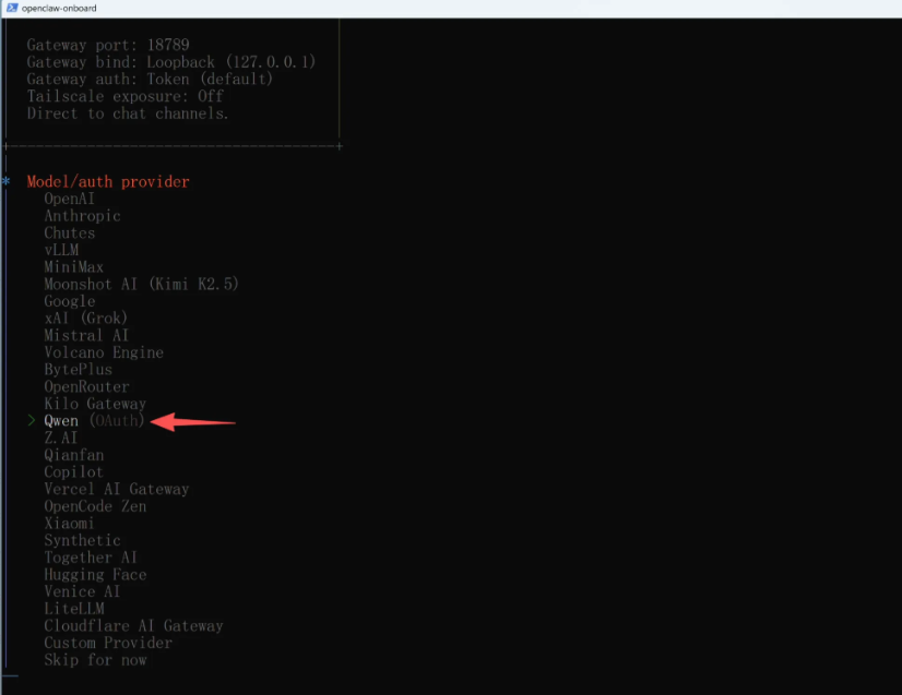 引导程序会列出一些 AI 平台供你选择,比如 Anthropic(Claude)OpenAI(GPT)、Qwen(通义千问)等。