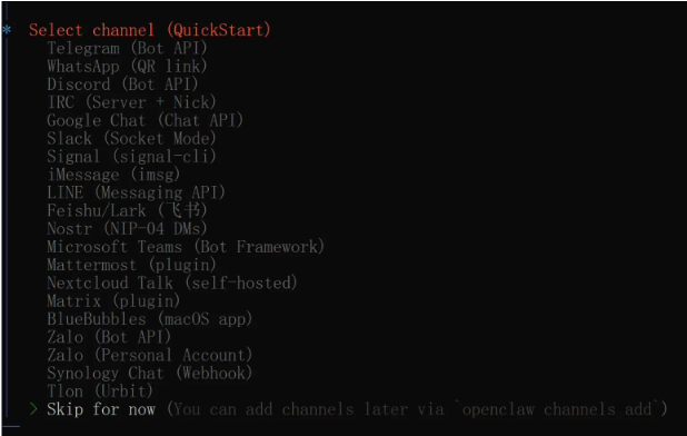引导程序会问你要不要连接Telegram、WhatsApp、Discord、飞书等聊天平台,更方便地跟龙虾对话。